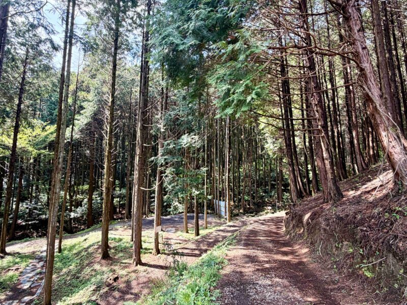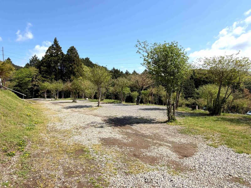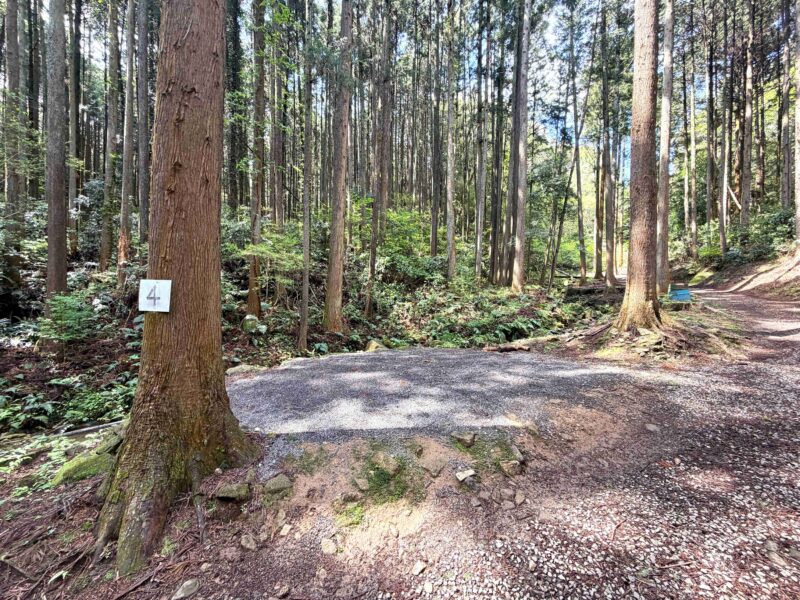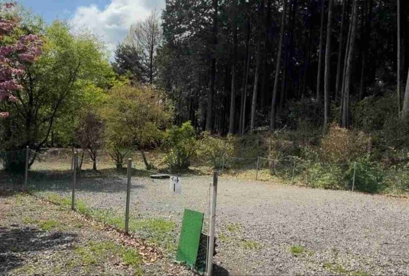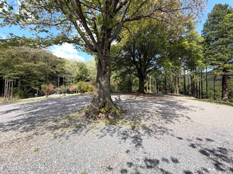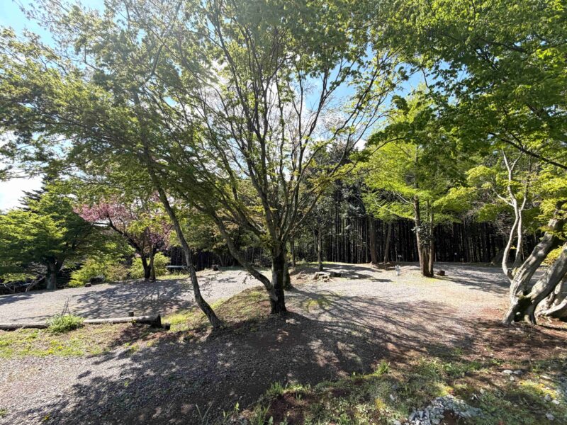 地面は砂利で汚れも少なく過ごしやすそうな場所、木々に囲まれているから自然をより感じられる