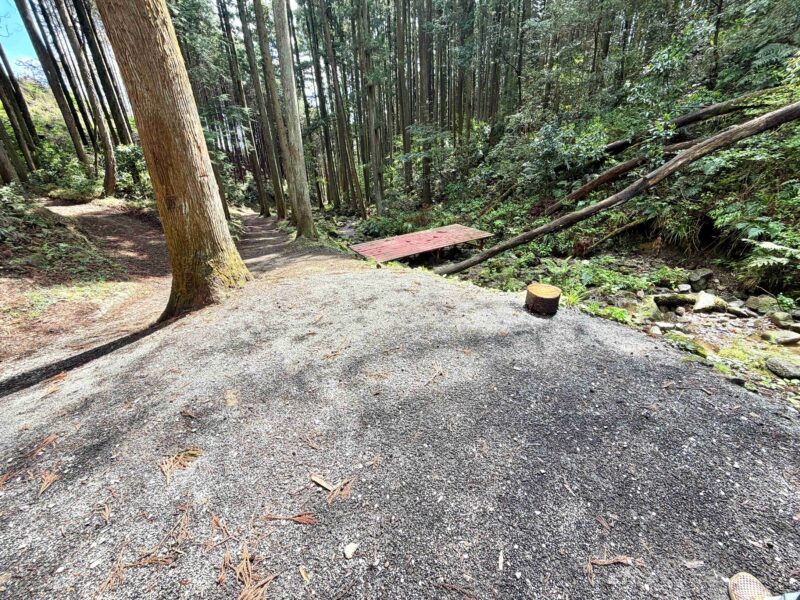 メインエリアから細道を下って渓流にたどり着く、野営感があって静かに自分のキャンプを楽しめそうな場所