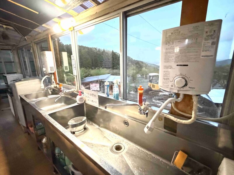 受付(管理棟)はお湯が利用できるけど、ツリーハウスと出入口にある水場はタンクに溜めた水になるよ