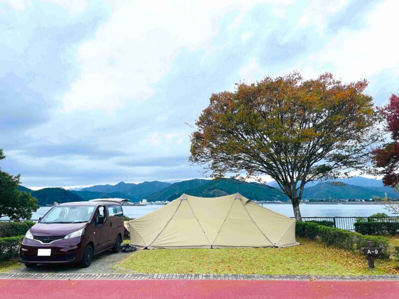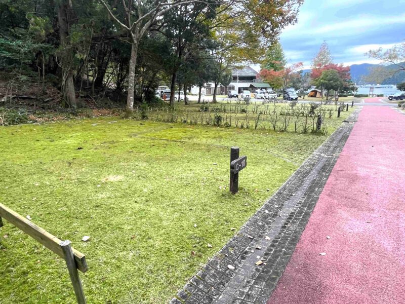 サイトは横幅9~10m、奥行き10mくらいと広いのだけど、車の停車位置が決まっているから、テントの形によっては配置に迷うかもしれない