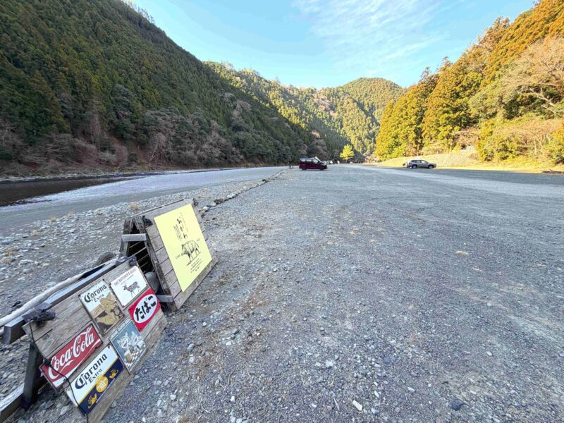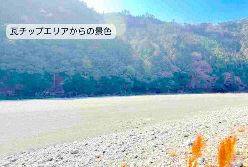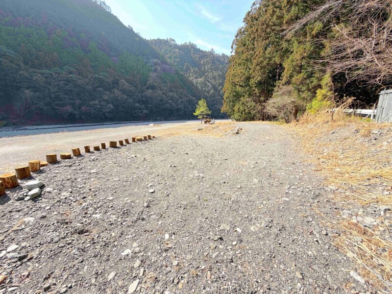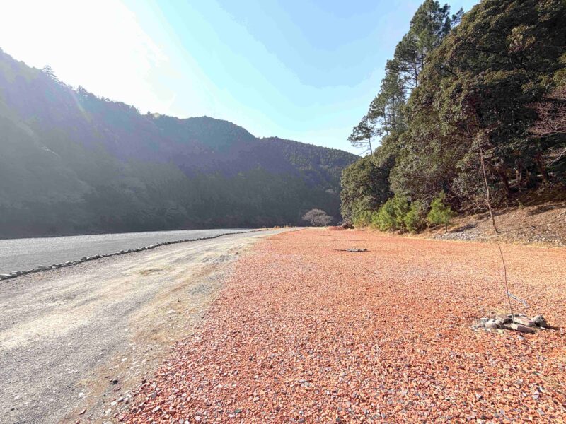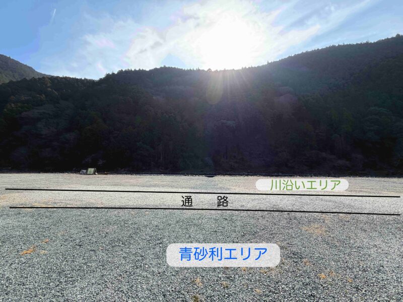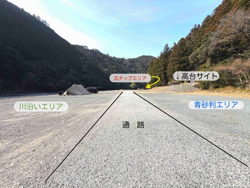 紹介するにあたって私が勝手にオートフリーサイトの中を「川沿いエリア」「青砂利エリア」「瓦チップエリア」「奥のエリア」で分けてるよ