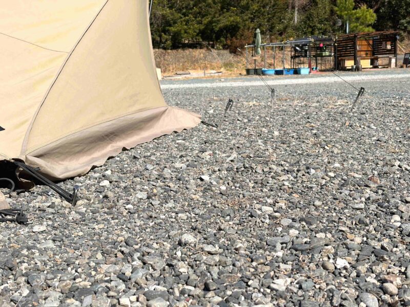この硬さを避けるなら、青砂利エリアや瓦チップエリアに行くとスムーズにペグ打ちできるよ♪