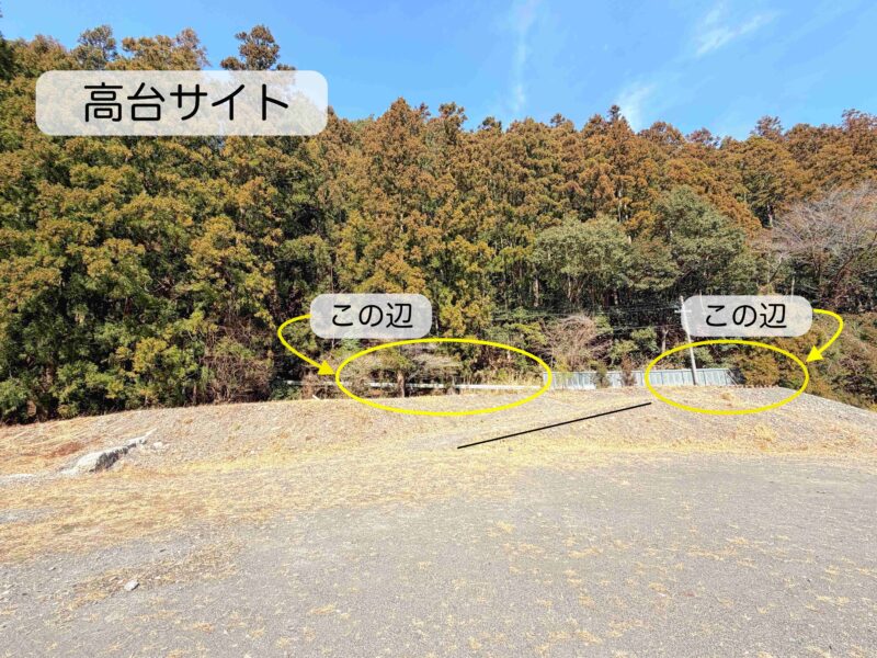 高台サイトには2区画ある感じで、空間的には制限があるから大型テントの設営はむずかしい