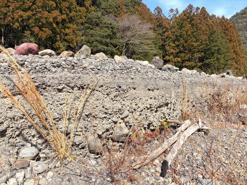 管理人さんが教えてくれたけど、以前10トン車が出入りしていたからかな〜って!川側に降りてみるとすごい層になっているのがわかるよ