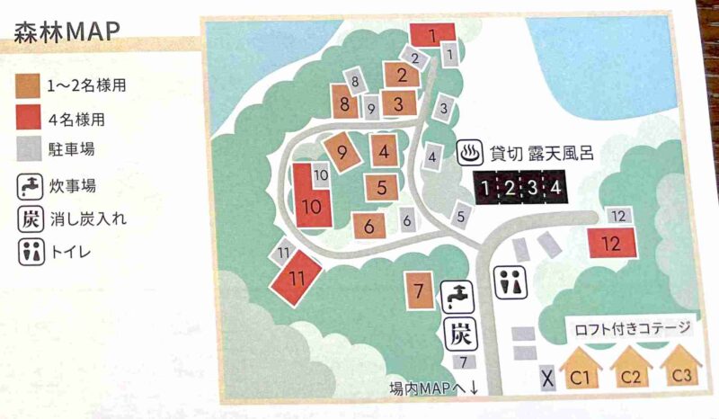 電源サイトは炊事場周辺と、通常サイトの側面にあって木々に沿った場所と中央あたりと選べたよ!